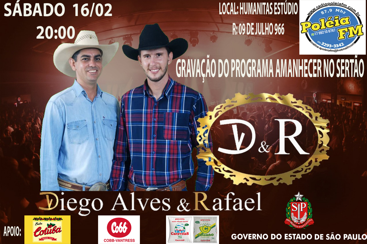Ás 20 horas a Associação do Desenvolvimento Artístico Cultura e Social de Palestina (ADAC PALESTINA ) mantenedora da rádio Poléia FM, Recebe Diego Alves e Rafael, para a gravação do Programa Amanhecer no Sertão, a dupla tem no seu repertório o melhor da musica caipira, a nossa verdadeira musica raiz.