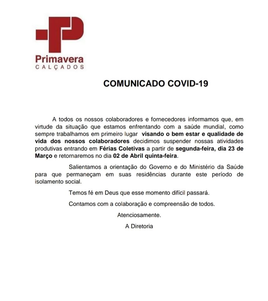 Ainda na nota calçados Primavera ressalta a importância de todos ficarem em casa e a preocupação com a saúde de seus colaboradores.