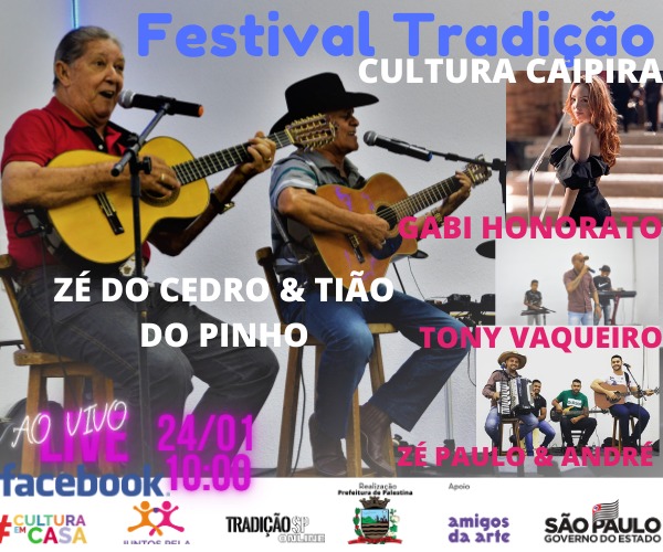 O Festival da Cultura Caipira, vai ser realizado dia 24 de Janeiro as 10:00 da manhã On Line nas redes Sociais da Prefeitura e dos artistas participantes.