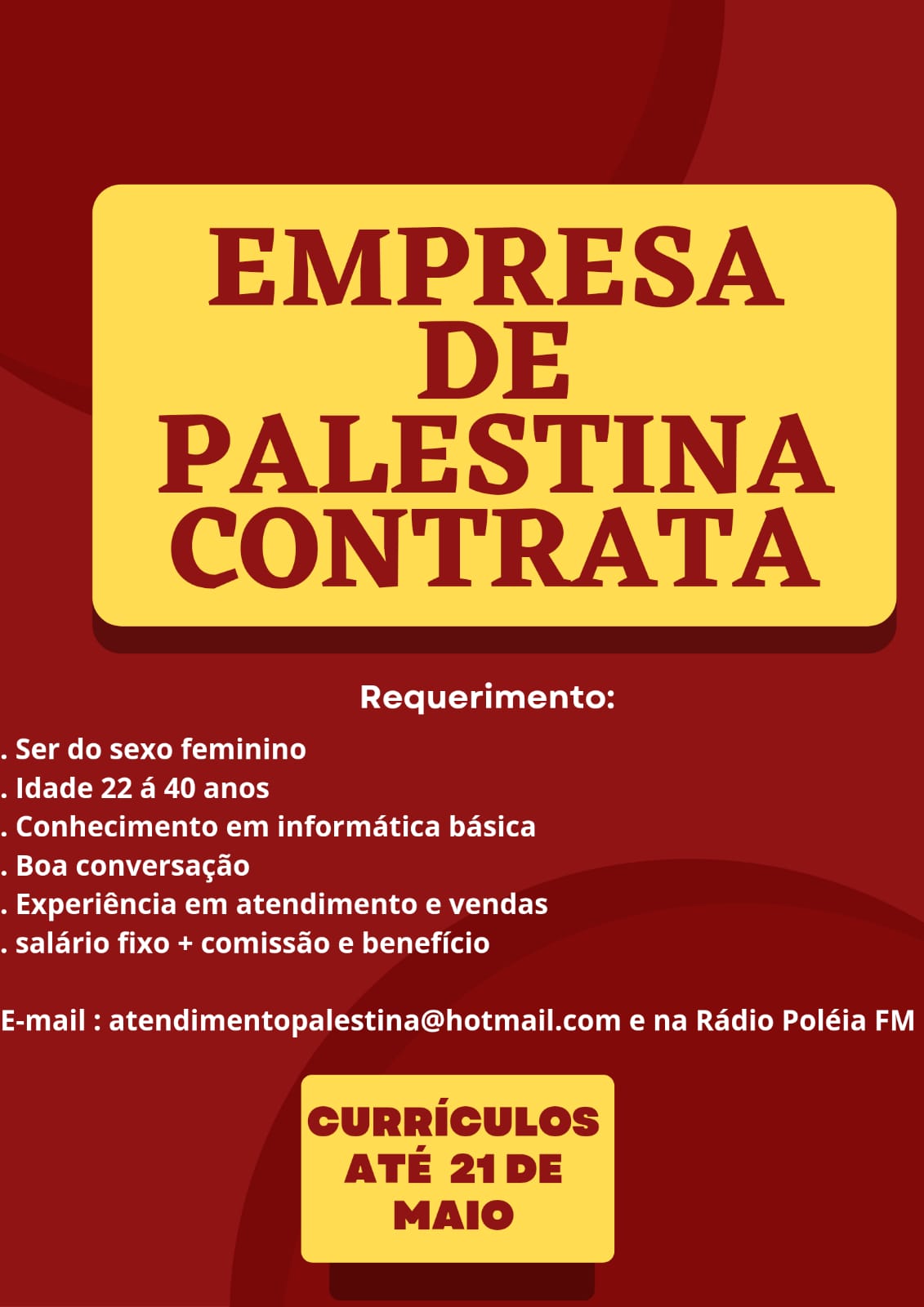As interessadas devem enviar currículo até o dia 21 de maio, para atendimentopalestina@hotmail.com ou na Rádio Poléia FM.