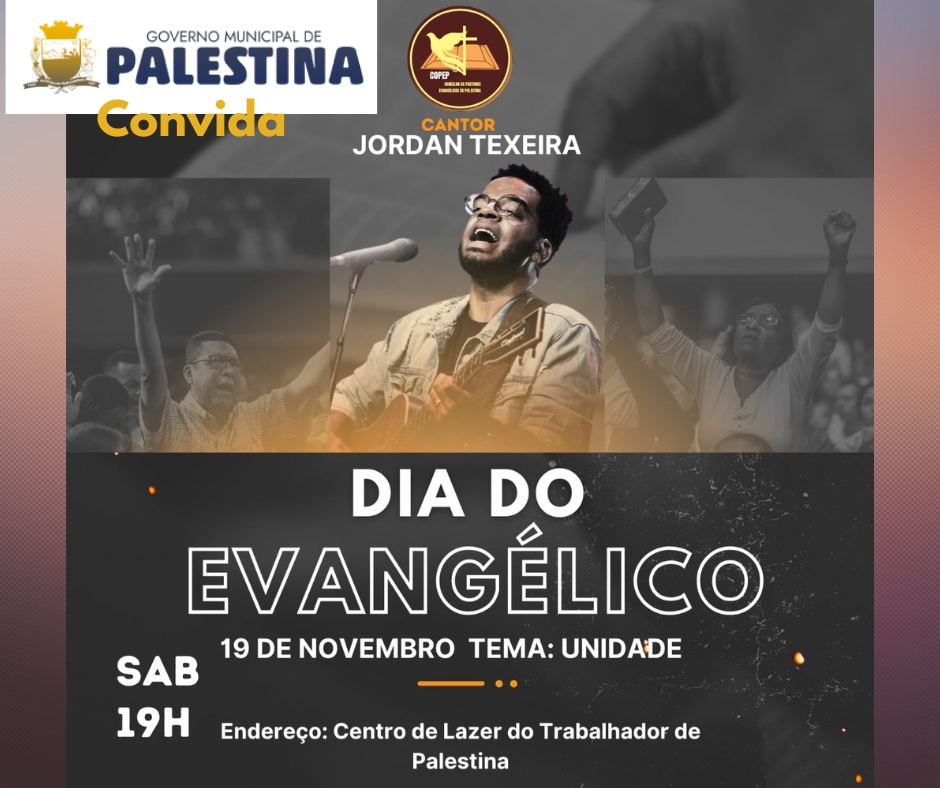 próximo sábado dia 19 de novembro, o Governo Municipal de Palestina realiza as comemorações do dia do Evangélico em nossa cidade, com o tema UNIDADE, o evento reúne as