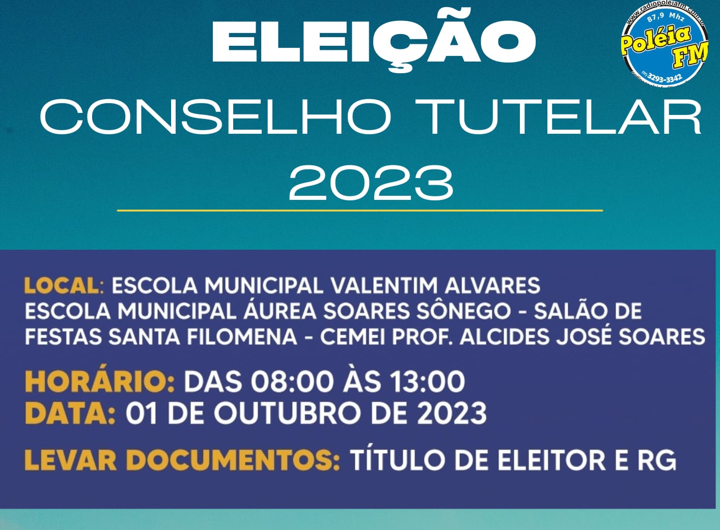 A eleição para o título de conselheiro tutelar irá acontecer no dia 01 de outubro, das 08h00 ás 13h00. Você poderá votar na Escola Valentim Álvares, na Escola Áurea Soares Sônego, Salão de festas Santa Filomena e Cemei Prof. Alcides José Soares.
